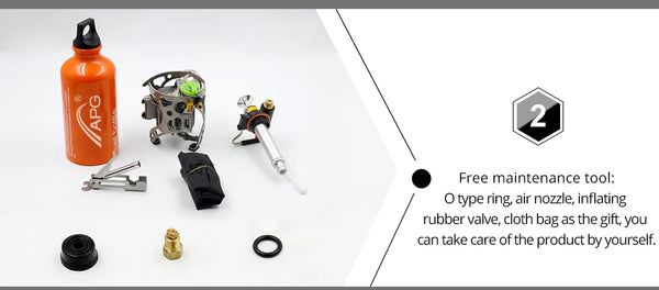 • Includes: Stove, Fuel Bottle, Pump, Maintenance Tools, Cloth Bag, Replacement Hardware