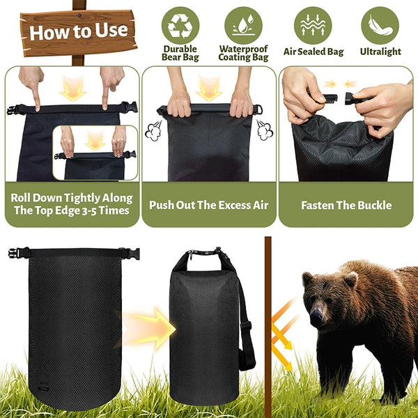 Waterproof & Durable – Made from strong 210T polyester with a roll-top closure to block scent and water.